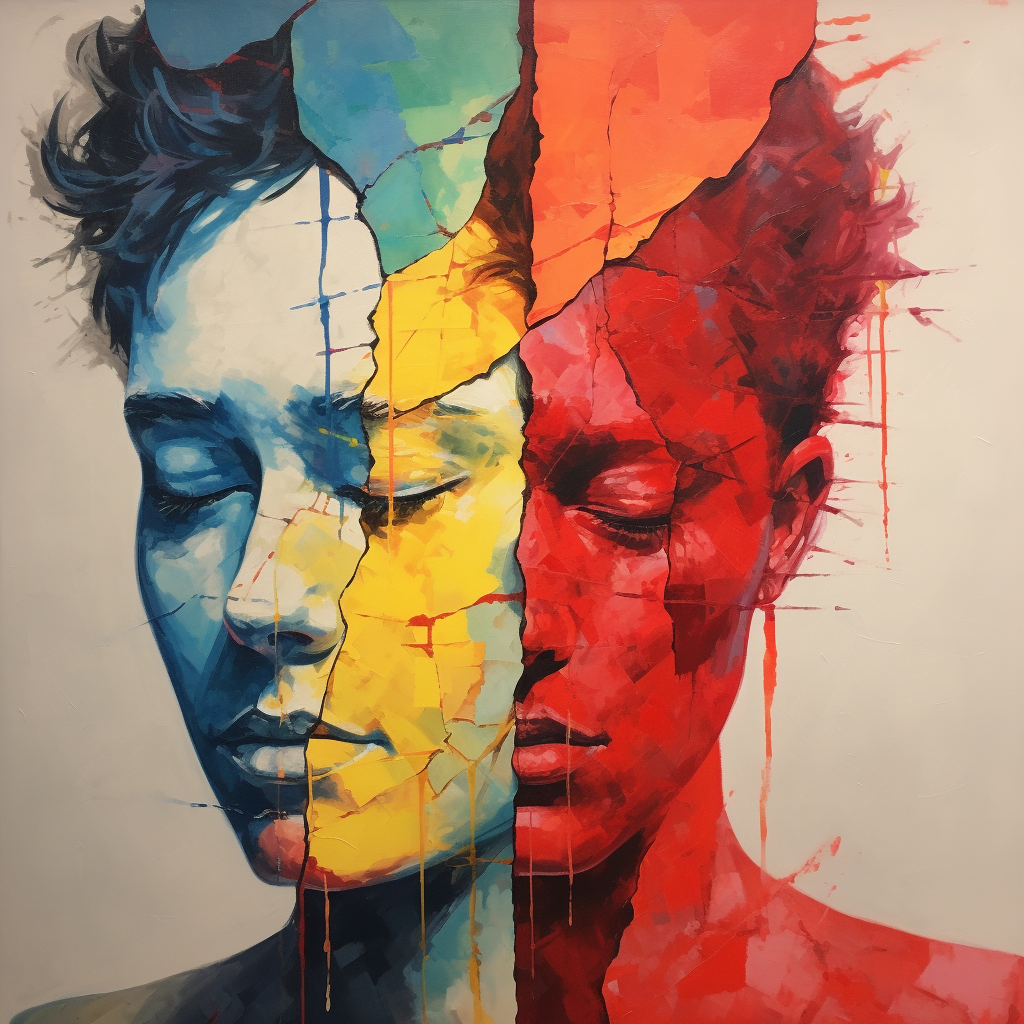 * Created on Jan. 24th, 2024, by MidJourney (v5.2) with the prompt, “queer, being splitted totally into two pieces, and each can’t connect to one another, dissociated, can’t get in touch with, split, rupture, more splitted, much more separate, disconnected, scared, can’t get in touch with reality, on the edge, indifferent.”  Final image generated without any further variation but as part of a process testing with different emotion / affect prompts.