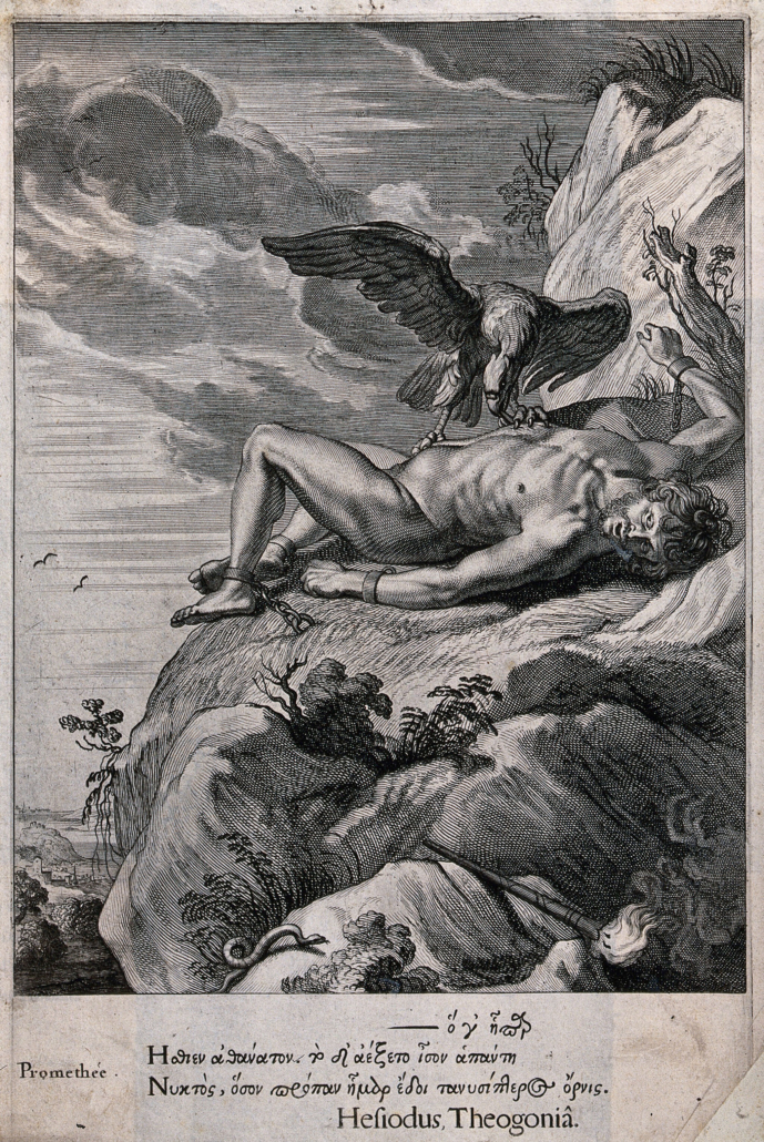 Prometheus bound to a rock, his liver eaten by an eagle and his torch dropped from his hand |