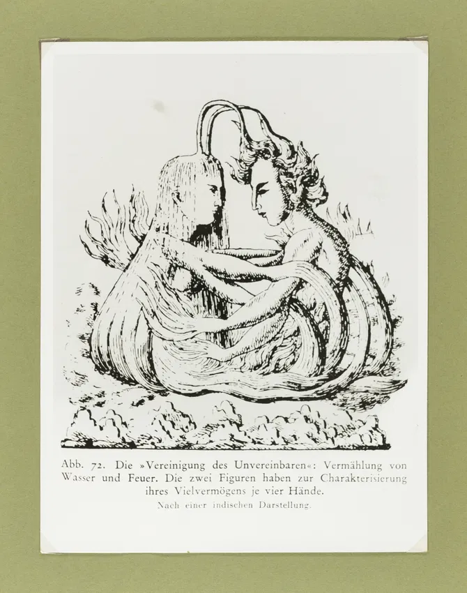 The “union of the irreconcilable” — the marriage of water and fire — after an Indian depiction. The figures have four hands to “characterise their many abilities”. Image from Carl Jung, Psychologie und Alchemie (Zürich: Rascher, 1944), who sourced the illustration from Plate II of Niklas Müller, Glauben, Wissen und Kunst der alten Hindus (Mainz, 1822) | https://publicdomainreview.org/essay/images-from-the-collective-unconscious/